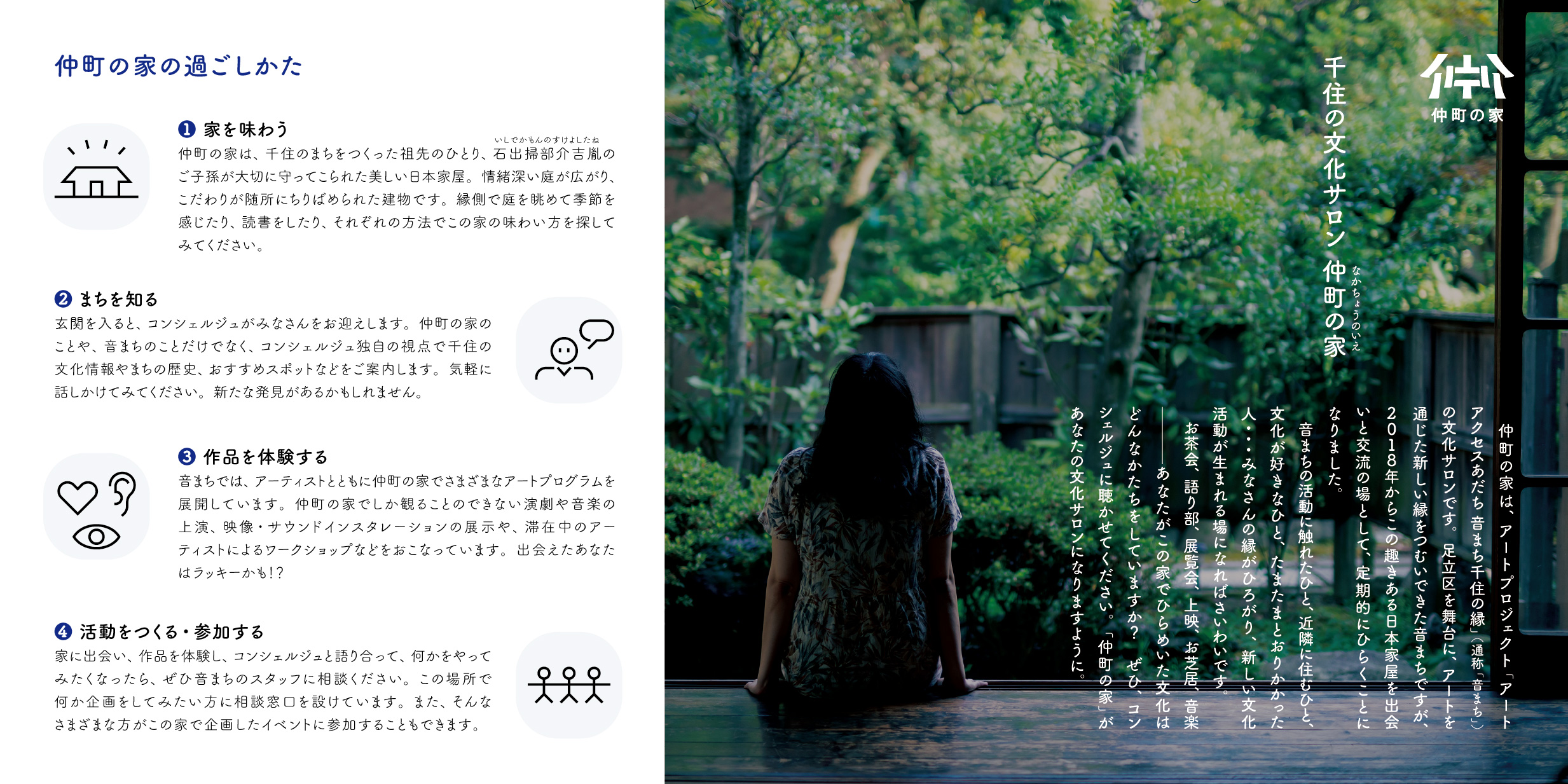 さまざまな団体に活用されることで、多様な人々が集い、芸術と出会い、交流する地域の文化拠点形成をめざします。2017年度からその第一歩として「仲町の家」の活用法や可能性を探るパイロットプログラムを実施しています。